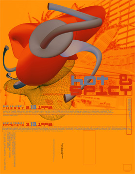 Eastern Michigan University Hot & Spicy is a 3-D organic creature born from the idea of design metabolism. Simulated organs are alternately stomach, heart, hot pepper or motor, and the input/output ports process desire and consumption. Designed to promote guest lecturers Martin Venezky (Appetite) and Rick Valicenti (Thirst) to students and professionals. Designed with Eli Carrico. |